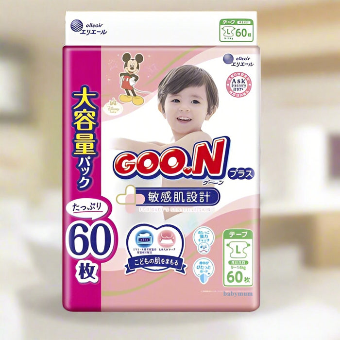 GOO.N Plus Premium Baby Nappies Tape Size L (9-14kg) – Unisex, Hypoallergenic for Sensitive Skin – Japan Quality